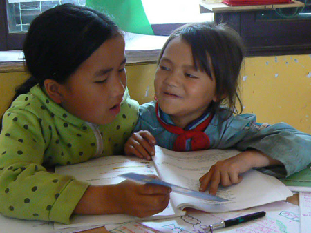 Sùng Thị Cha và Vàng Thị Nhứ - hai cô bé ở Trường Tiểu học Tả Phìn (Lào Cai) đang học bài theo mô hình VNEN. Ảnh: Phương Chi