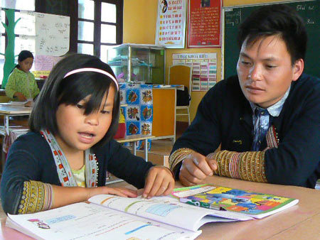 Anh Lý Dào Phin có 2 con học ở Tiểu học Tả Phìn theo mô hình VNEN. Ảnh: Phương Chi